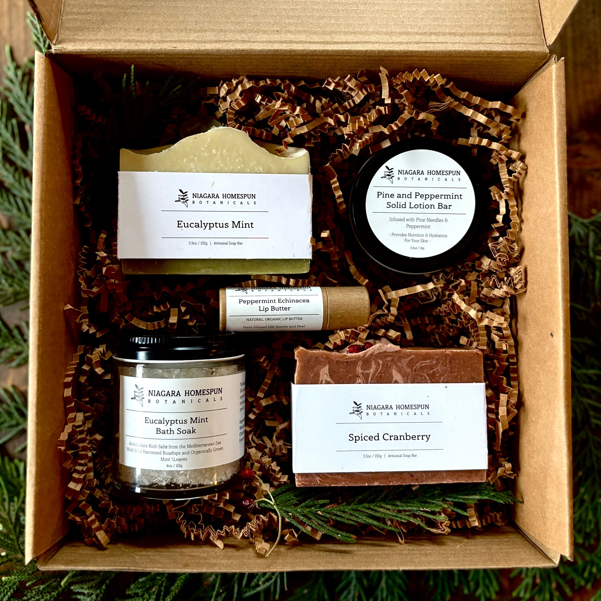 This set has two of our Holiday Soaps, Eucalyptus Mint and Spiced Cranberry, paired with a Pine and Peppermint Lotion Bar, Peppermint Lip Butter and a Mini Eucalyptus Mint Bath Soak. Opening this box is guaranteed to spread Christmas spirit!